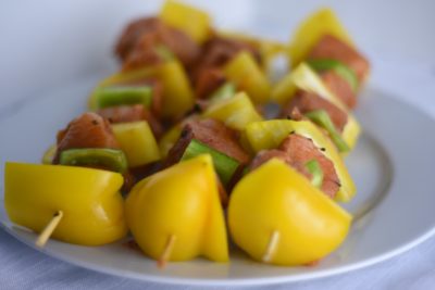 4. Mettre sur brochette de bois ou autre en alternant les cubes de poulet et les légumes