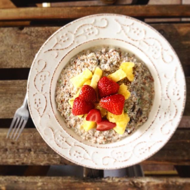 • Dans un bol de format moyen, mélanger le yogourt, la poudre de protéine, la banane, les céréales pour bébé et le jus de citron avec la poudre formée. Si la crème semble trop épaisse, ajouter un peu plus de lait d’amande.