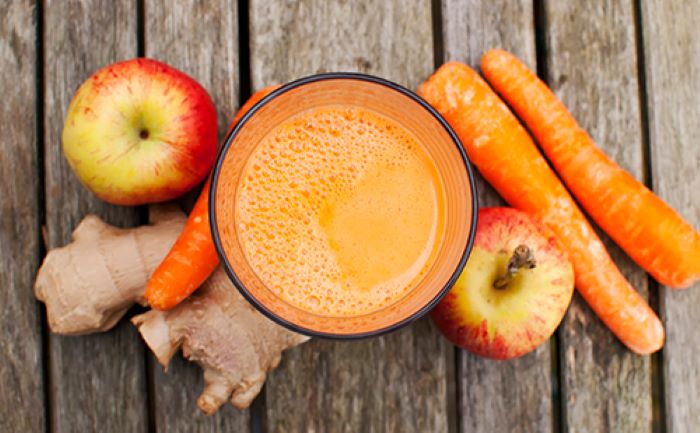 1. Récupérez le jus jus de la pomme, des carottes, du citron et du gingembre à l’aide d’une centrifugeuse.