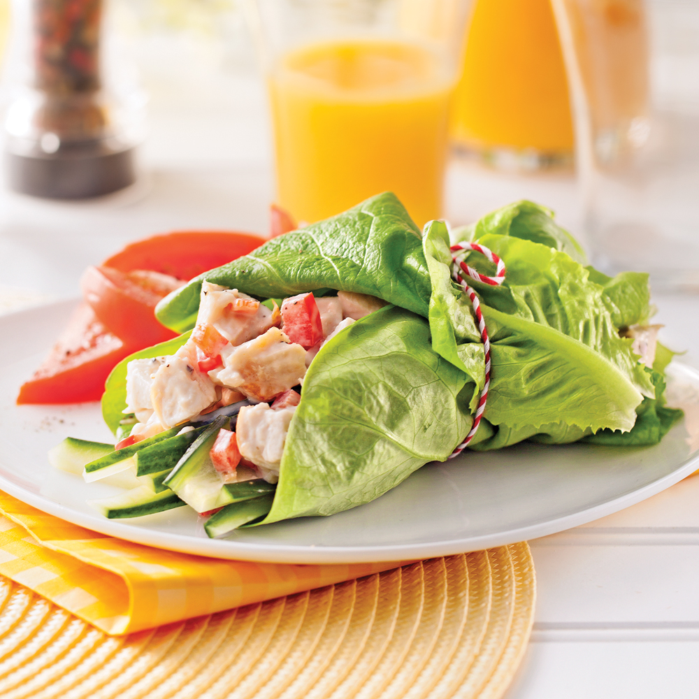 2. Répartir le concombre et la salade de poulet sur quatre feuilles de laitue.