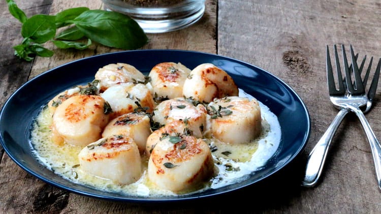 9. Dans une assiette, arroser les pétoncles d’un peu de sauce au citron, parsemez d’un peu plus de thym et servir.