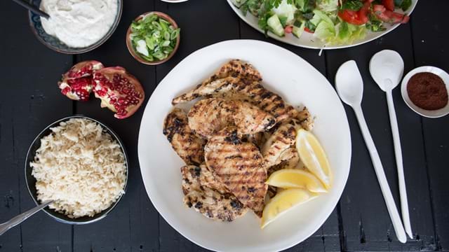 1. Dans un grand bol, mélanger le yogourt, le zeste et le jus de citron, le beurre de sésame, l’ail et les épices.